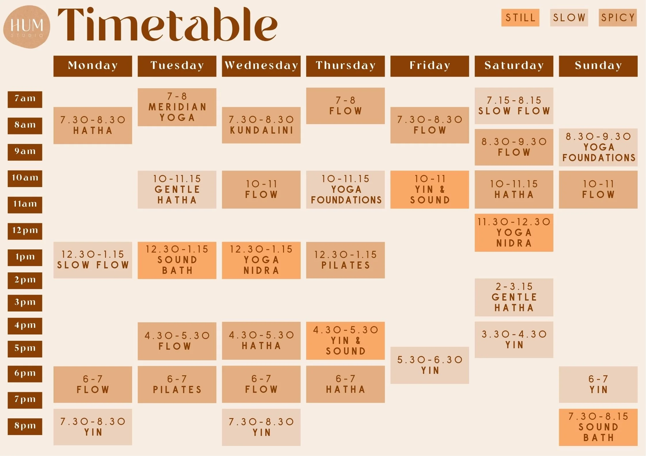 Our timetable is colour coded so you can easily see which classes are Still, Slow and Spicy. Still classes are perfect for when you wish to quiet the mind and focus inward, Slow are for cultivating a mind-body connection, and Spicy are for increasing strength and building inner fire.